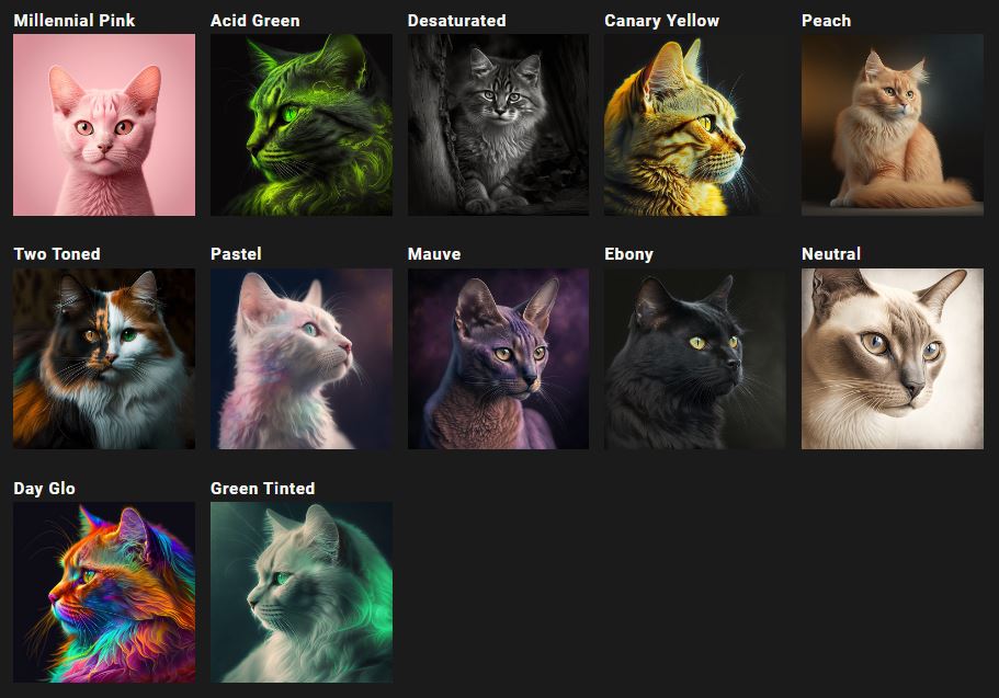 Millennial Pink / Acid Green / Desaturated / Canary Yellow / Peach / Two Toned / Pastel / Mauve / Ebony / Neutral / Day Glo / Green Tinted