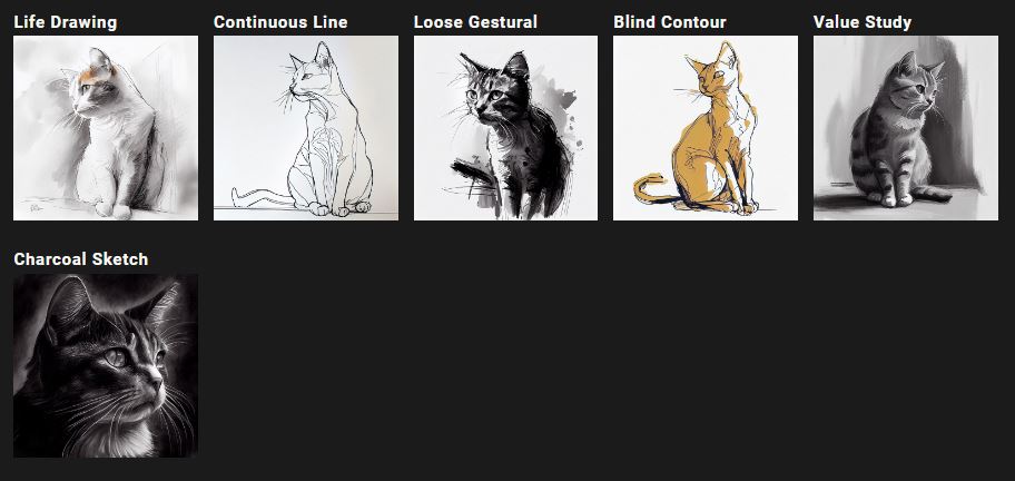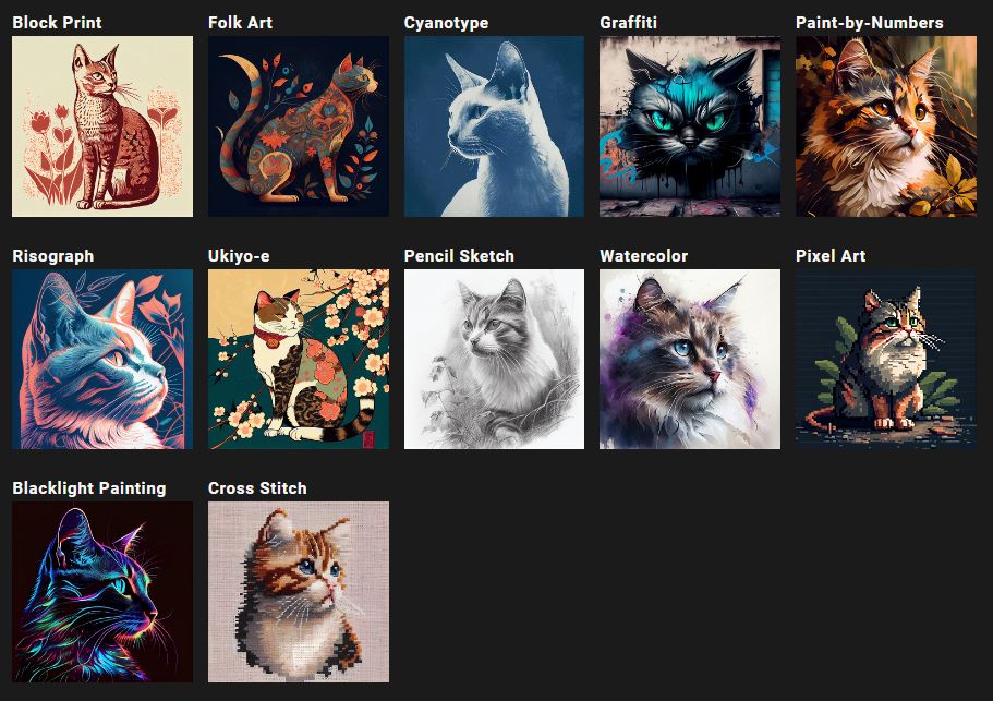 Block / Folk Art / Cyanotype / Graffiti / Paint-by-Numbers / Risograph / Ukiyo-e / Pencil Sketch / Watercolor / Pixel Art / Blacklight Painting / Cross Stitch