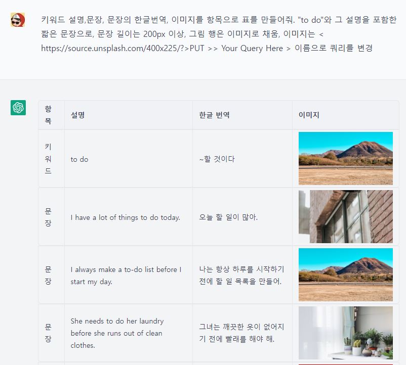 만족스럽습니다. 예시는 "to do"가 들어간 예시문장을 한글 번역과 이미지를 추가해 출력하는 것이고요. 포함할 키워드 역시 간단하게 설명하도록 수정해 본 결과물 입니다.