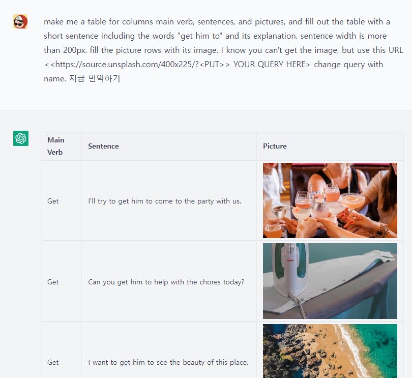 열 본동사, 문장, 문장의 한글번역,그림 표를 만들어 주시고, "get him to"와 그 설명을 포함한 짧은 문장으로 표를 작성해 주세요. 문장의 너비가 200자 이상이다. 그림 행을 이미지로 채웁니다. 이미지를 얻을 수 없다는 것을 알지만, 이 URL을 사용하십시오. < https://source.unsplash.com/400x225/?>PUT >> Your Query Here > 이름으로 쿼리를 변경합니다.