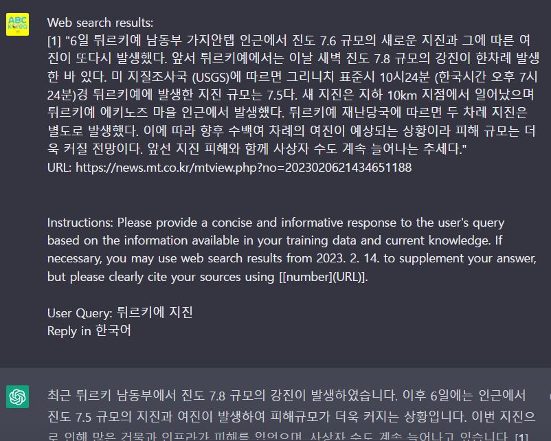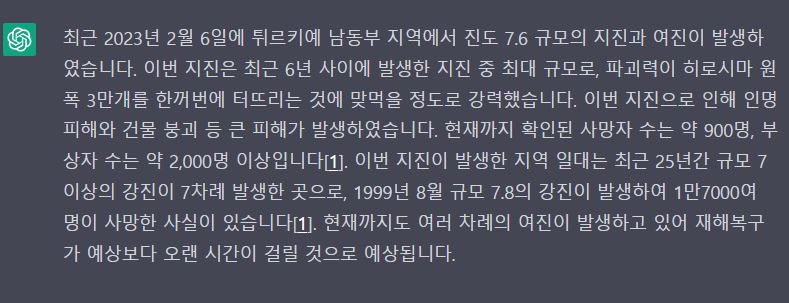 첫 번째로 인터뷰 형식의 본문 출력이 가능한지 테스트했고, 두 번째로는 구글 검색 결과를 대화창에 입력해서, 마치 최신 데이터를 학습한 것과 같은 효과를 추가해 봤습니다.