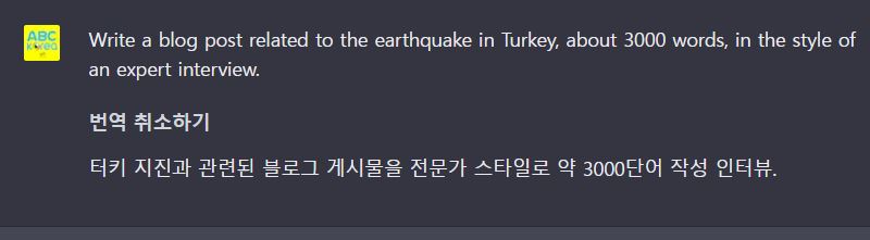 터키 지진과 관련된 인터뷰 형식의 글을 작성해 보려고 합니다. 아무래도 많은 분량의 답변을 출력하시려면 영어로 질문하시는 게 유리하고, 속도도 빠르다는 것도 기억해 두시면 좋을 것 같습니다.